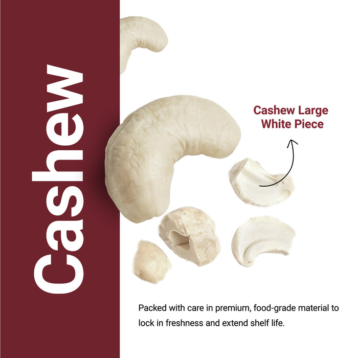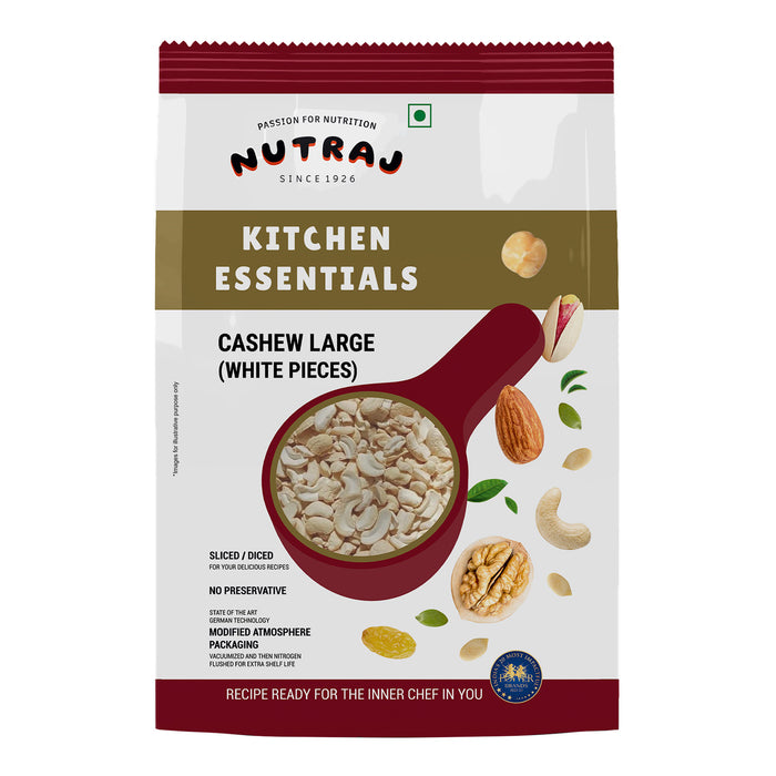 Nutraj Large White Cashew Pieces are bright, uniform cuts perfect for bakery, namkeen, sweets, muesli, cereals, and food manufacturing. Their clean appearance and crunchy bite enhance both texture and flavour. Packed with natural energy, healthy fats, and essential nutrients, they integrate seamlessly into recipes. Hygienically processed and sealed to retain long-lasting freshness and purity.