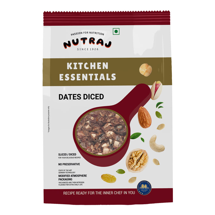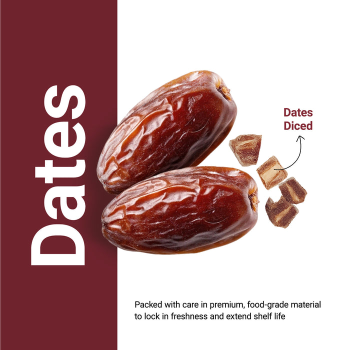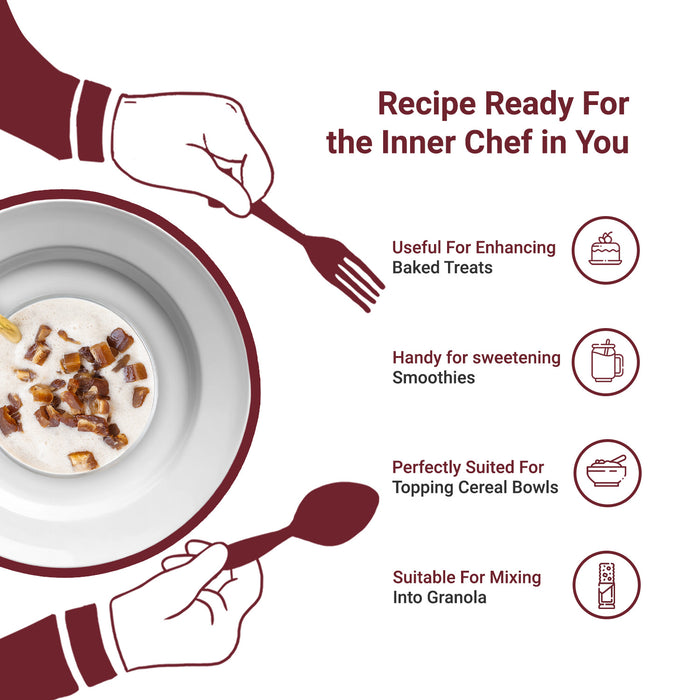 Date Diced consists of uniformly cut date pieces sized 3mm–7 mm, offering natural