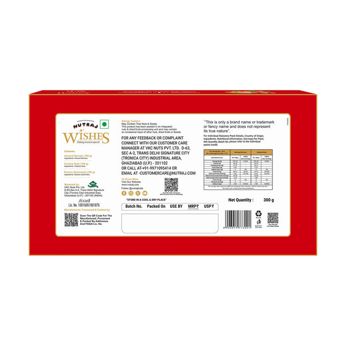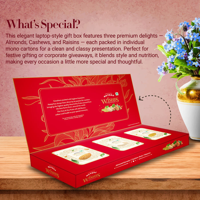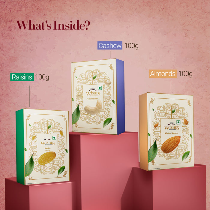With 300g of handpicked dry fruits, this elegantly curated box features a trio of classics, each packed in sleek individual mono cartons for a refined and hygienic presentation.