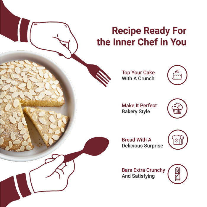 Sliced dry fruits are used in cakes, pastries, cookies, croissants, Indian sweets and dessert garnishing.