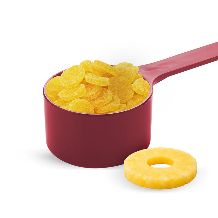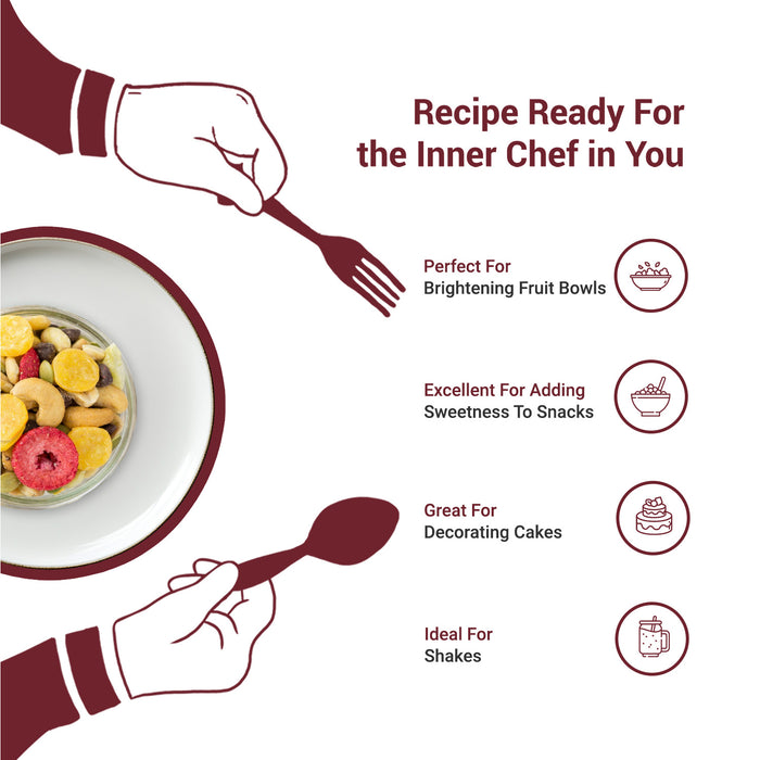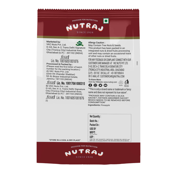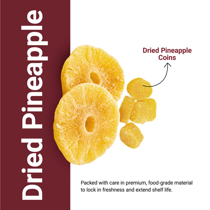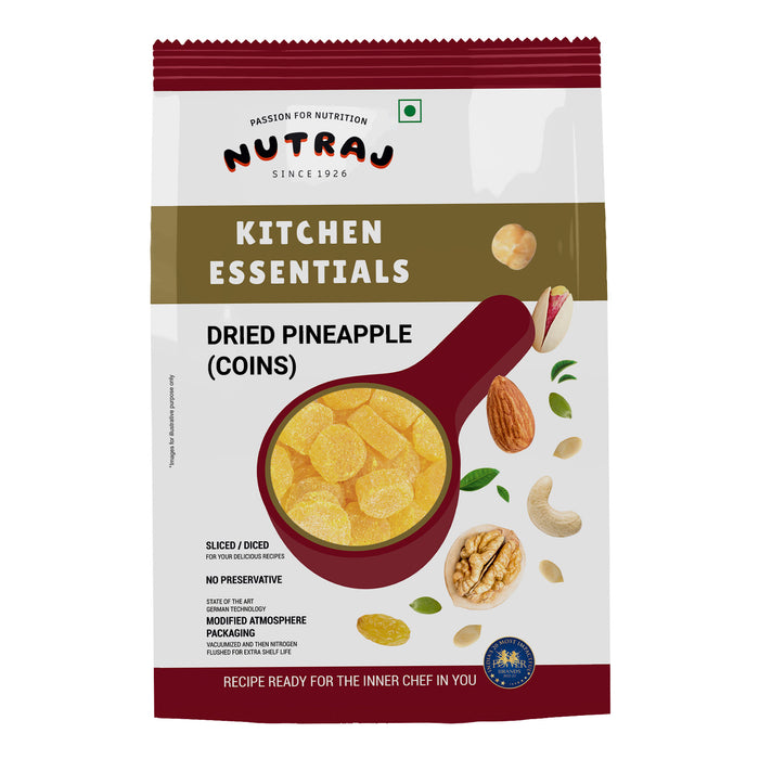 Nutraj Pineapple Coins are small, convenient slices offering tangy-sweet tropical flavour ideal for bakery, cereals, trail mixes, desserts, and decorative use. Packed with vitamins and antioxidants, they bring nutrition and colour to dishes. Cleanly processed and packed to maintain freshness.